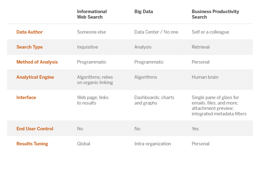 When a knowledge professional performs a business productivity search, they generally have an idea of what they are looking for. They may be searching for a sales proposal from two years ago, a PowerPoint discussing GDPR compliance, or an email sent to the CFO last month with a proposed budget in a spreadsheet attachment. For these very common, in fact hourly, use cases, a search solution with a user-friendly interface that allows humans to use their institutional business memory recall to iteratively search and filter through their information assets is needed. Business productivity search is not big data analytics and it is not web retrieval. It is its own use case with a workflow and interface that is tailored to the end users.